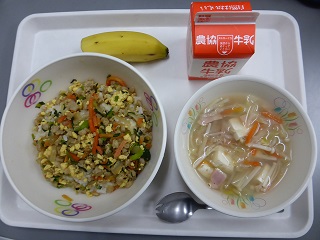 カレーそぼろ」ごはん、千切りスープ、バナナ、牛乳