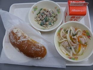 アーモンド揚げパン、うどんスープ、ビーンズサラダ、牛乳