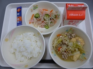 ごはん、肉じゃが、ホロホロ和え、牛乳