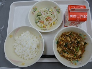 ごはん、麻婆豆腐、春雨サラダ、牛乳