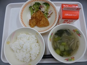 ごはん、チキンカツ、野菜ソテー、みそ汁、牛乳