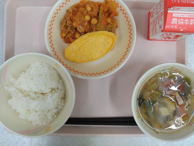 今日の給食は目を日頃よく使うので「ビタミンA強化」の献立です。青のり、小松菜・ほうれんそう葉物類、人参、かぼちゃを使用しています。目の筋肉に疲労を蓄積させないように毎日意識して食べて視力を保ちましょう。
