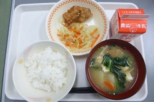 ごはん、とりのから揚げ、たくあん和え、みそ汁、牛乳