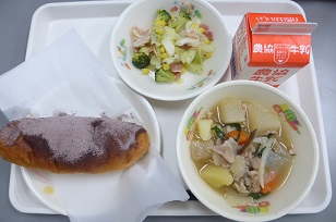 今日はココア味の揚げパンです。1年生は口も周りがココアになってしましました。