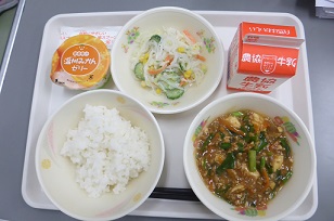 ごはん、麻婆豆腐、春雨サラダ、みかんゼリー、牛乳