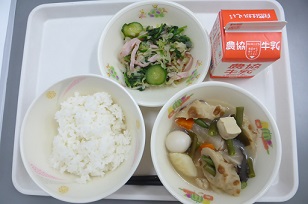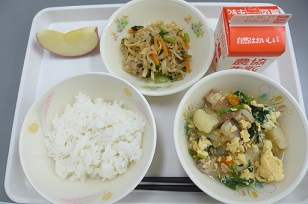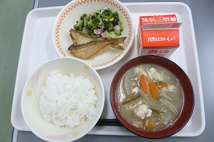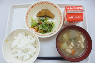 ごはん、ハタハタのから揚げ、野菜ソテー、けんちん汁、牛乳