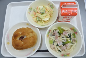 今日は、うどんを洋風に味付けした、スープです。パスタとして使いました。