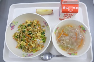 ごはん、たまごとじ、切干し大根のピリ辛炒め、フルーツ、牛乳