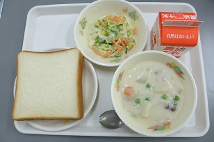 ミルク食パン、クリームシチュー、コールスロサラダ、牛乳