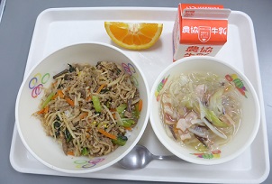 ビビンバ、春雨スープ、オレンジ、牛乳