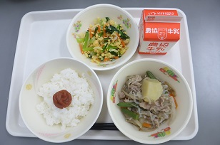 ごはん、肉じゃが、ホロホロ和え、うめぼし、牛乳