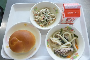 キャロットパン、肉うどん、かみかみサラダ、牛乳