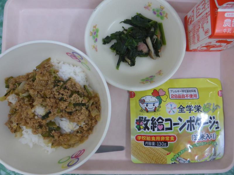 本日は学校給食用の非常食コーンポタージュを全員で食べました。