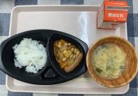 むぎめし、豆腐のカレー煮、ひじきのマリネ、牛乳