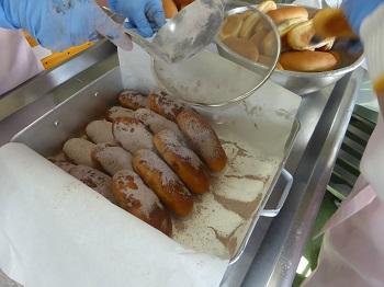 ココア揚げパンは調理室でコッペパンを揚げて、粉糖とココアを混ぜたものを揚げたてのパンにかけています