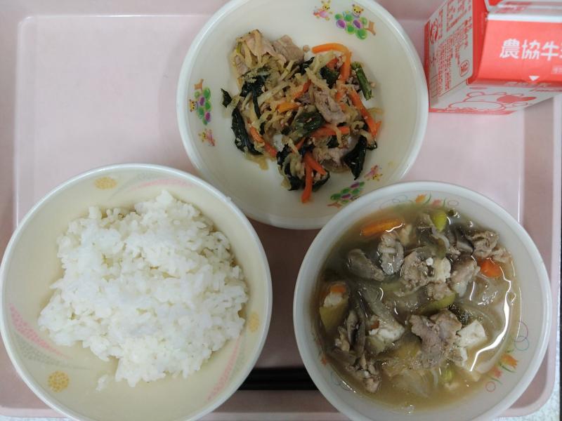 ごはん、すき焼き風煮、こまつなの煮浸し、牛乳