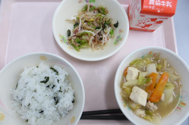 今日の献立は旬のたけのこです。たけのこがワカメに隠れてしまい、写っていません。今月最後の給食でした。