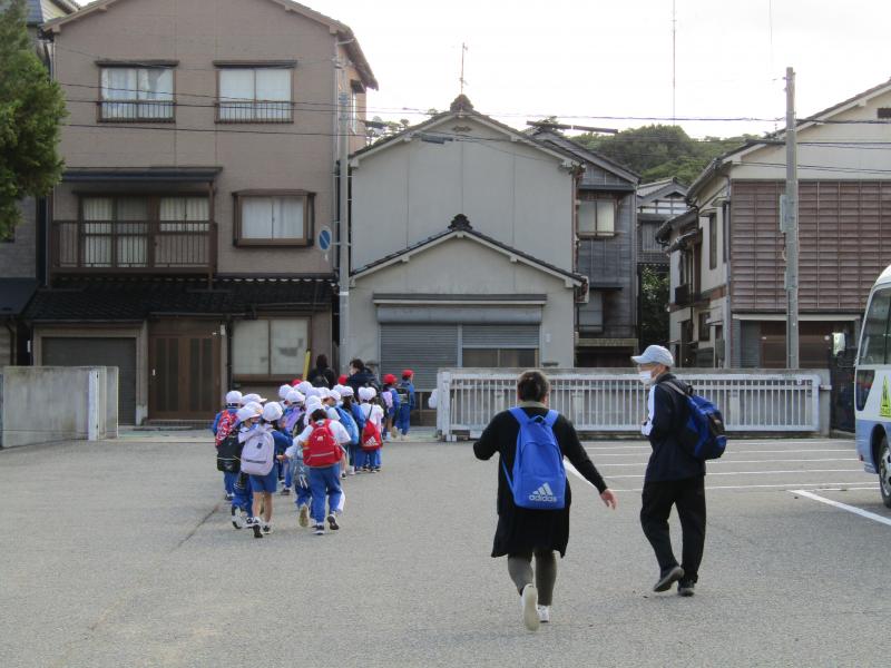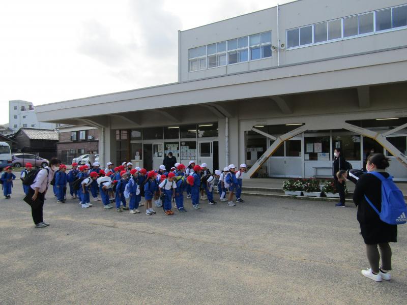今日はバス遠足です。写真は1年生の出発の様子です。
