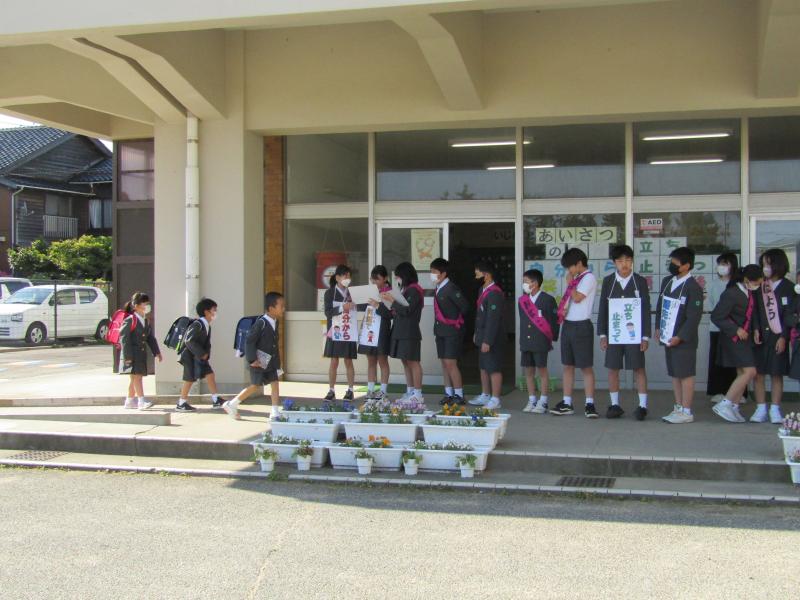 あいさつ運動は放送委員会・給食委員会のみなさんです。