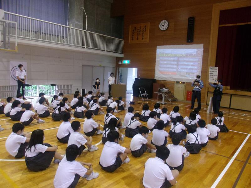 7月29日(水)の1限目に交通安全教室を実施しました。新型コロナウイルス感染防止の為、5月より延期になっていた教室です。規模を縮小して本日行うことができました。しかし、雨模様の為、3年生の自転車実技は中止となり体育館で輪島警察署交通課、朝市交番の皆様による講話と安全指導が行われました。3年生以外の学年は、警察からお借りした交通安全DVDを教室で視聴し、意見交換する等担任指導の下で交通安全について再確認をする予定です。3年生の聴く態度が大変立派でした!よく頑張りましたね3年生!素晴らしかったです。