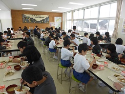 ランチルームで1年生と6年生がなかよし給食をしています。