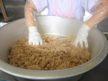 河井共同調理場では具材に味付けをして、ごはんに混ぜ込みます