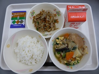 ごはん、たまごとじ、五目キンピラ、ふりかけ、牛乳