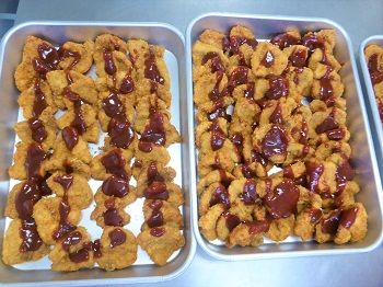 揚げたふぐカツに手作りのソースをかけます