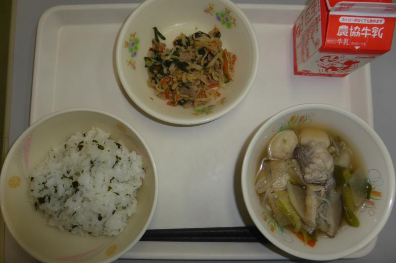 ・フグ鍋風 (肌寒い季節なので、ふぐをはじめて汁物にしました。他の魚だと冷めてしまうと魚臭さが出てきますが、フグは美味しく頂けました。他の魚よりプリっとした弾力もあり、また汁物に入れてみようと思います。来年のフグ(2月9日はパン給食の日)の日はご飯の日ではないので今回の汁物を参考にして、3学期も献立に入れてみます。)