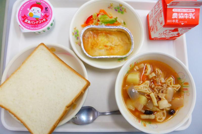 ・大豆入りミネストローネ←本日のかみかみ給食は発芽大豆を入れて噛むことと満足感を意識しました。