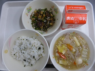 わかめごはん、八宝菜、小魚揚げ煮、牛乳