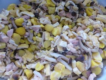 給食では、まず能登栗、油揚げ、しめじ、鶏肉に下味を付けます