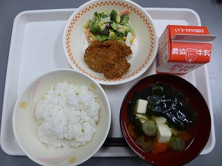 ごはん、トンカツ、コーンサラダ、すまし汁、牛乳