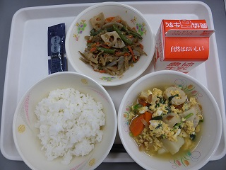 ごはん、たまごとじ、五目キンピラ、のりの佃煮、牛乳