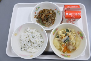 わかめごはん、たまごとじ、五目きんぴら、牛乳