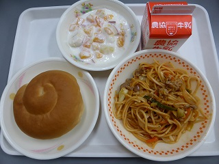 ミルクロール、イタリアンスパゲッティ、ヨーグルト和え、牛乳