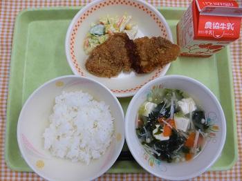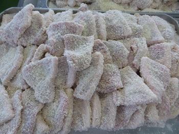 給食室では、αのめぐみに衣を付けて揚げ、手作りのソースをかけました