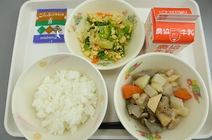ごはん、いりどり、ホロホロ和え、ふりかけ、牛乳