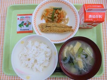 今日は麦ごはん、かむふりかけ、シシャモフライ、五目きんぴらといった、“噛む”ことを意識したメニューです