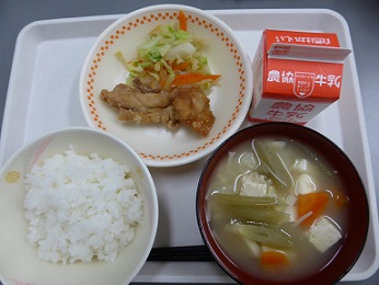 ごはん、とりのから揚、たくあん和え、五月汁、牛乳