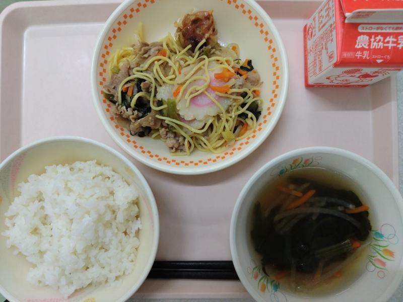 *中学年の量です。パン給食時に必ずあった焼きラーメンを今年初めて登場しました。乾麺なのでパン給食時との