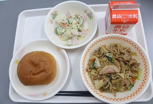 胚芽パン、ソース焼きそば、ごまマヨサラダ、牛乳