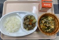 ごはん、筑前煮、茎ワカメとキムチのスープ、牛乳