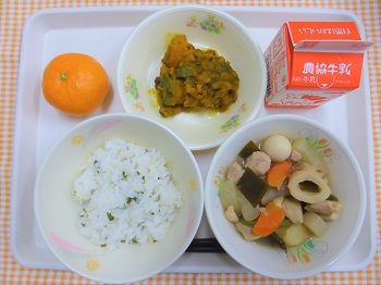 今日の給食は、みかん、かぼちゃ(なんきん)、だいこん、にんじん、こんにゃく、こんぶ、いんげん、などの「ん」が付く食材を、たくさん使用しました