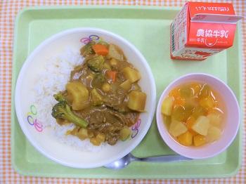 子ども達が大好きなメニューは、やっぱりカレーライスかな?と思い一学期最後のメニューにしました