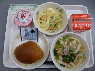 バターロール、うどんスープ、たまごサラダ、お祝いゼリー、ブリーベリージャム、牛乳