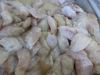 下味をつけたふぐに、かたくり粉を付けて揚げ、タレをからめます