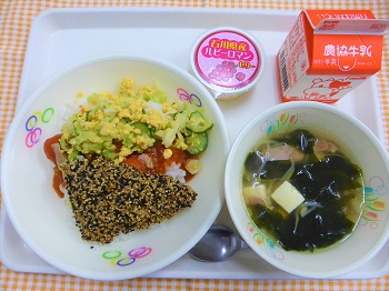 実際の給食では半熟の目玉焼きや生野菜は提供できませんが、さばやソースはもこみちさん考案のレシピです