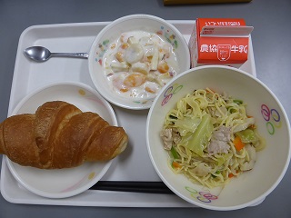 クロワッサン、焼きラーメン、ヨーグルト和え、牛乳