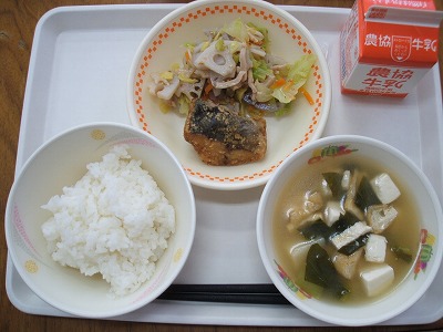 今日の給食は,ごはん,ガンドの竜田あげ,レンコンサラダ,みそ汁,牛乳です。